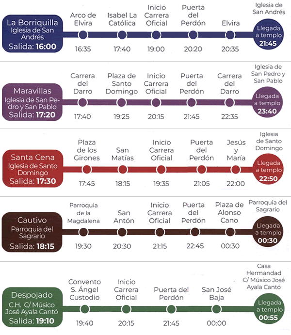 Llegarán a la Carrera de la Virgen a las 20:50, entrando por la Acera del Darro y la calle Puente de la Virgen, Catedral 22:05 y regresan a las 00:55 poniendo fin al Domingo de Ramos en Granada.