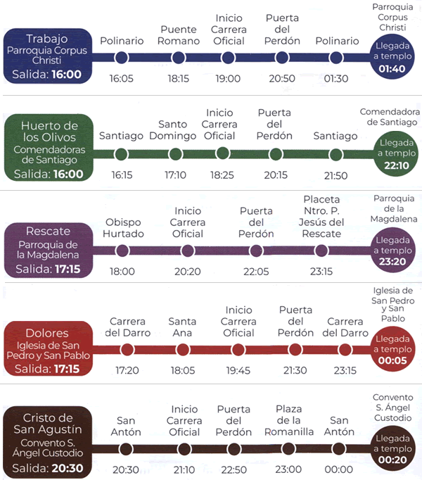 Tribuna Oficial a las 20:30 y entrada a la Catedral a las 21:20. Regresa a su Templo a partir de las 00:05.
