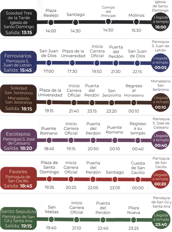 Siguen el mismo itinerario que los Ferroviarios San Jerónimo, Escuelas( 19:20), Trinidad y Recogidas (20:30). Entran por Puente de la Virgen a la Carrera Oficial a las 21:40.